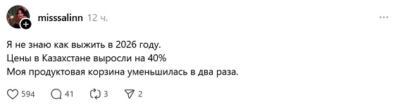 «Я не знаю, как выжить в 2026 году. Цены в Казахстане выросли на 40%. Моя продуктовая корзина уменьшилась в два раза», – написала автор ветки Алина.