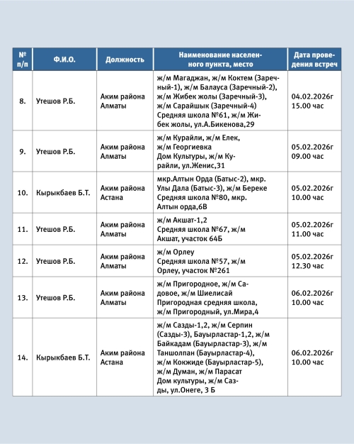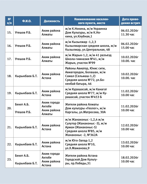 Опубликован график встреч акимов города Актобе и районов Астана и Алматы с населением в первом полугодии, передает «Диапазон» со ссылкой на городской акимат.