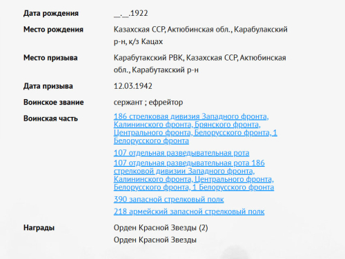 Данные актюбинского снайпера с сайта «Память народа.ру». || скрин с сайта pamyat-naroda.ru