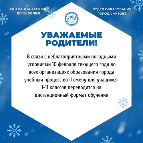 - В связи с неблагоприятными погодными условиями 10 февраля 2026 года учащиеся 1-11 классов второй смены переходят на дистанционный формат обучения, - сообщили в отделе образования города Актобе.