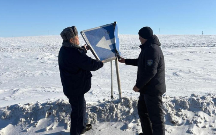 Полицейские также обратили внимание на покореженные дорожные знаки. их должны поменять. || Фото предоставлено департаментом полиции Актюбинской области.