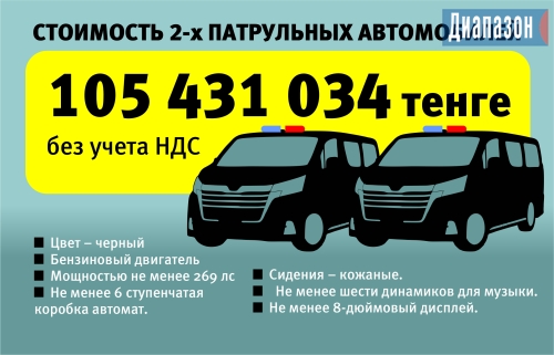 Две патрульные машины по 52 млн тенге за каждую хочет приобрести департамент полиции области, передает «Диапазон».