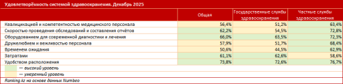 При этом, по данным международного сервиса Numbeo, казахстанцы в целом умеренно довольны своими затратами на лечение. В государственных клиниках уровень удовлетворённости составил 62,6%, в частных - 58,6%. Именно стоимость услуг остаётся самым слабым местом частной медицины.