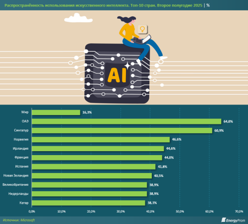 В мировых лидерах - ОАЭ (64%) и Сингапур (60,9%): там ИИ уже используют больше половины работников. А в конце списка - Камбоджа (5,1%) и несколько стран Центральной Азии.