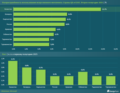 В Казахстане - каждый седьмой. Во втором полугодии 2025 года 13,7% работников применяли нейросети вроде ChatGPT и DeepSeek в работе. Это меньше, чем в среднем по миру, но больше, чем у соседей по Центральной Азии и ЕАЭС.