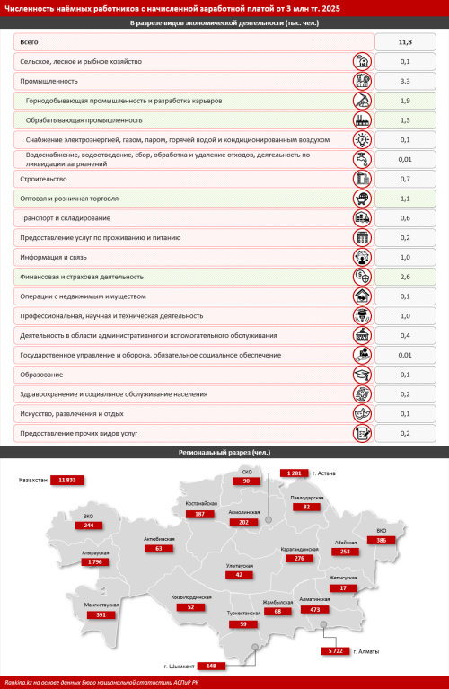 Больше всего работников с доходом свыше 3 млн тенге живут в Алматы (5,7 тыс. человек), затем в Атырауской области и Астане. В регионах, включая Актюбинскую область, таких специалистов значительно меньше.