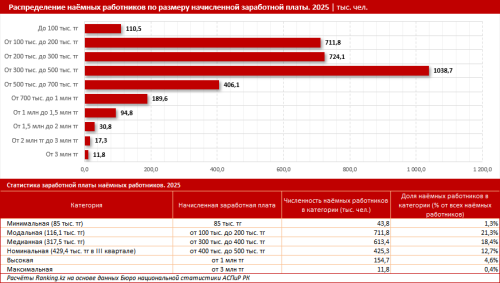 Самая массовая группа - это зарплаты от 300 до 500 тыс. тенге: более 1 млн человек. Ещё около 724 тыс. человек получают 200-300 тыс. тенге, и почти 712 тыс. - от 100 до 200 тыс. тенге.