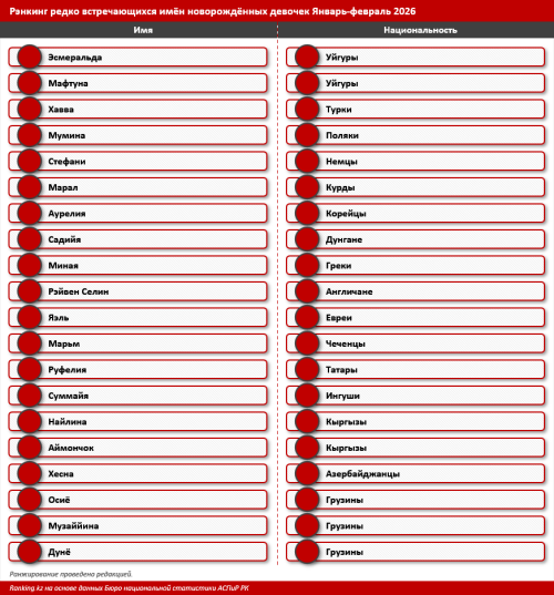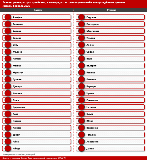 Интересная тенденция: привычные имена постепенно становятся редкостью. За этот период в стране не зарегистрировали ни одной Маши, имя Оля встретилось всего один раз. Всё реже называют девочек Катями и Ирами. Среди казахских имён тоже заметен спад: Әлия, Айнұр, Зарина сегодня звучат гораздо реже, чем раньше. Меньше стали использовать и такие имена, как Ұлдана, Сұлу, Гүлжан, Қарлығаш.