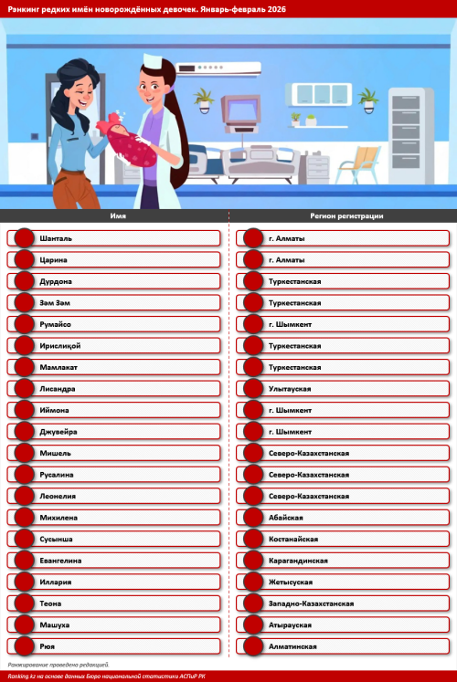 В 2026 году в Казахстане родители всё чаще выбирают для дочерей необычные имена. По данным Бюро национальной статистики, за первые два месяца года зарегистрированы сотни редких вариантов, многие из них - всего по одному разу, передает «Диапазон» со ссылкой на ranking.kz.