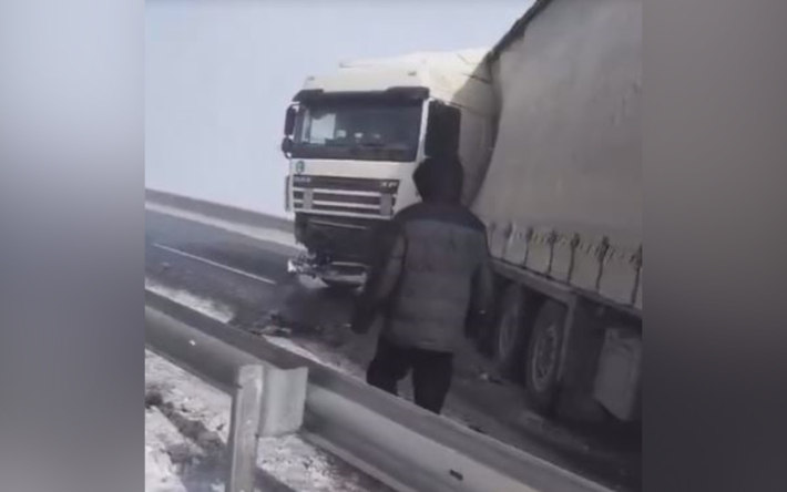 На кадрах видно, что на дороге от столкновения буквально развернуло большегруз, рядом автовоз с машинами в прицепе. На трассе метет, на асфальте валяются осколки от машины, металлическое ограждение погнуто.