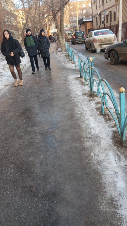 Кроме того, проход во двор школы не очищен ото льда. Калитка узкая, и возле неё сплошной лёд. Весь квартал и дорога, ведущая к школе, тоже покрыты льдом, из-за этого детям и родителям очень трудно и опасно идти в школу.