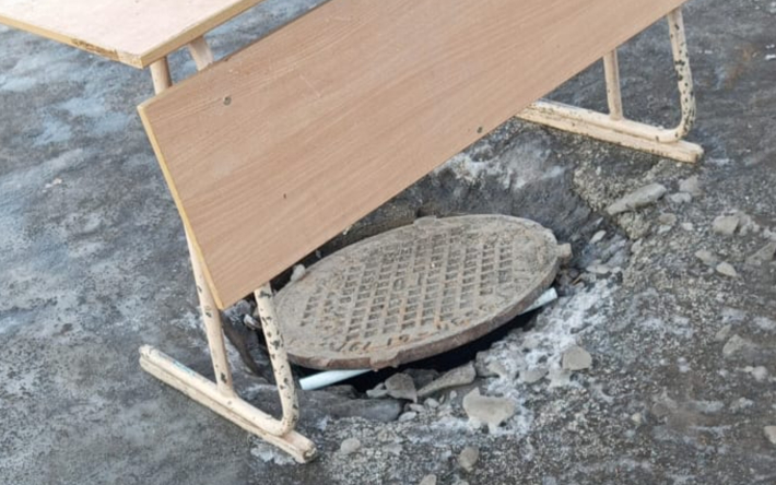 Во дворе школы №17 в Актобе есть опасная проблема — открыт канализационный люк. Его просто накрыли школьной партой, но дети двигают её туда-сюда, поэтому люк остаётся открытым. Это очень опасно, ребёнок может туда упасть.