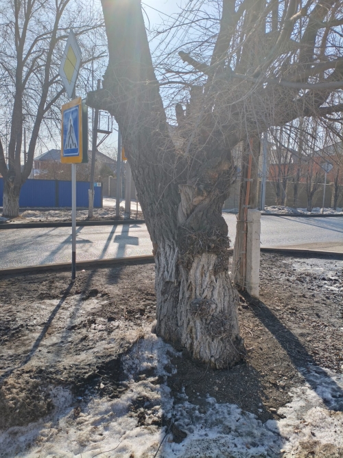 На перекрёстке улиц М.Оспанова и Тлепбергенова вот так стоят знаки. Чтобы пройти по пешеходному переходу, нужно спилить дерево и демонтировать столб. Сейчас перейти дорогу можно только по центру перекрёстка.