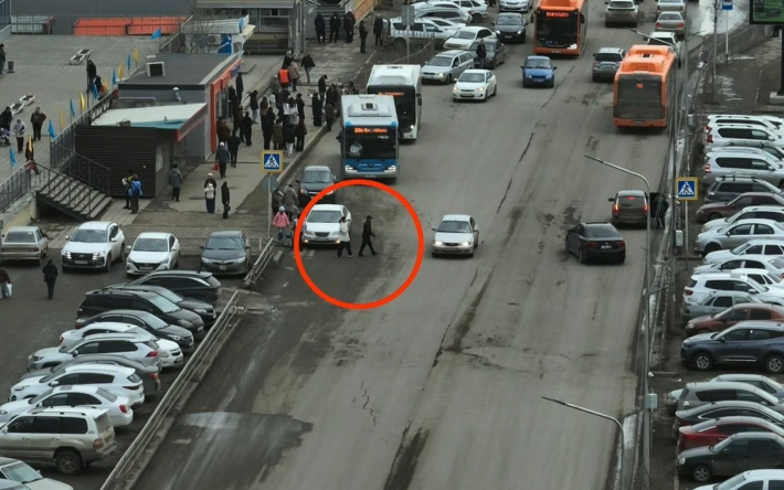 На этом кадре людей на переходе не пропустил автомобиль. Полицейским на земле передали информацию, и они сразу же остановили нарушителя. || Кадр с видео пресс-службы Департамента полиции Актюбинской области