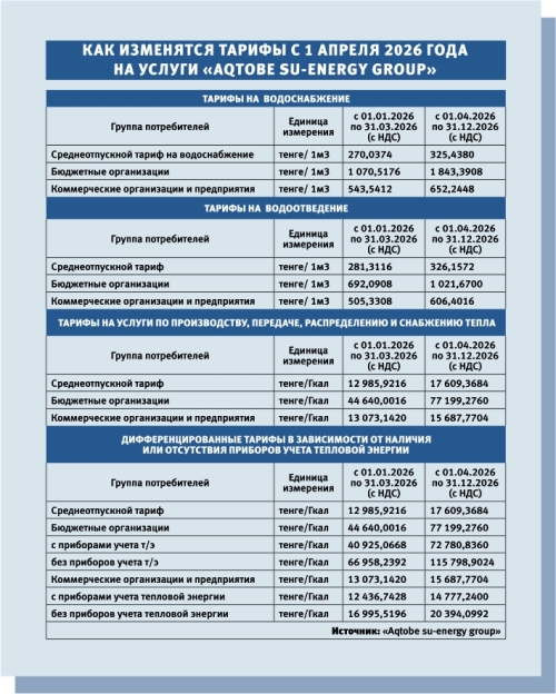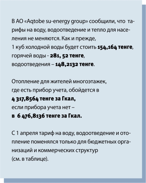 В АО «Aqtobe su-energy group» сообщили, что тарифы на воду, водоотведение и тепло для населения не меняются. Как и прежде, 1 куб холодной воды будет стоить 154,164 тенге, горячей воды - 281, 52 тенге, водоотведения – 148,2132 тенге.