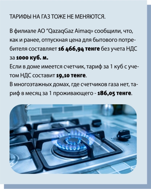 Тарифы на газ тоже не меняются. В филиале АО “QazaqGaz Aimaq» сообщили, что, как и ранее, отпускная цена для бытового потребителя составляет 16 466,94 тенге без учета НДС за 1000 куб. м.