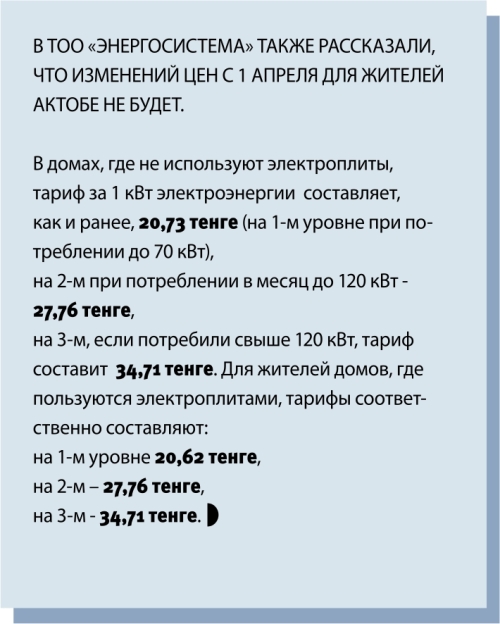 В ТОО «Энергосистема» также рассказали, что изменений цен с 1 апреля для жителей Актобе не будет.