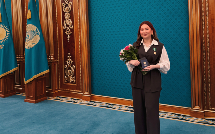 Аида Кадын в 19 лет преподает казахский язык, а еще активно занимается благотворительностью. Она – первая студентка в стране, которую наградили медалью «Шапағат», передает «Диапазон».