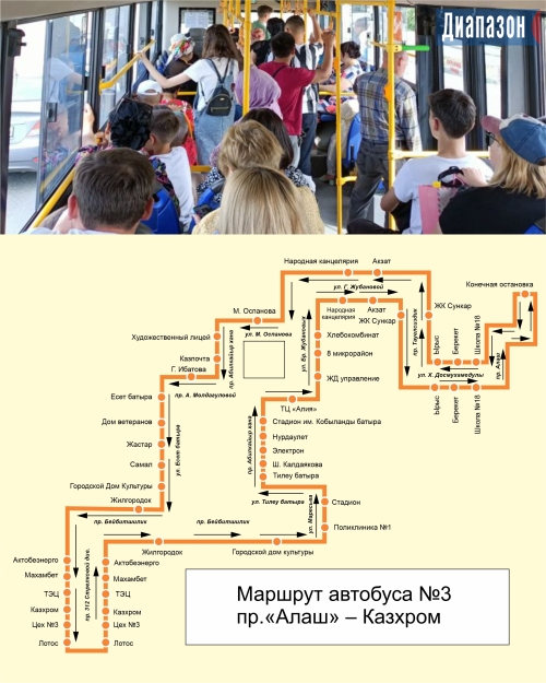 Обновленное название маршрута «Проспект Алаш – Казхром», передает «Диапазон».