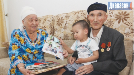 На фото: Балбыраум Талипова с супругом, тружеником тыла Жеткергеном. На двоих стаж работы в системе связи 75 лет. Пожилые люди воспитывают правнуков. || Фото Владимира ЗОБЕНКО