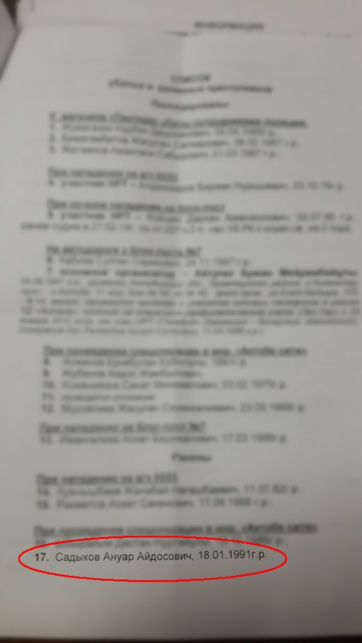 "В списке якобы ликвидированных террористов в Актобе сити, под номером 17 стоит имя и полные данные моего сына Ануара. Сын мой давно проживает в другой стране и никакого отношения не имеет ни к политике, ни тем более к террористам. Уверен, что все готовилось в КНБ, и террористов они придумали и ликвидированных лиц тоже. Кроме того, я считаю что в данном случае, это прямая и явная угроза, моей семье со стороны спецслужб", - написано там.