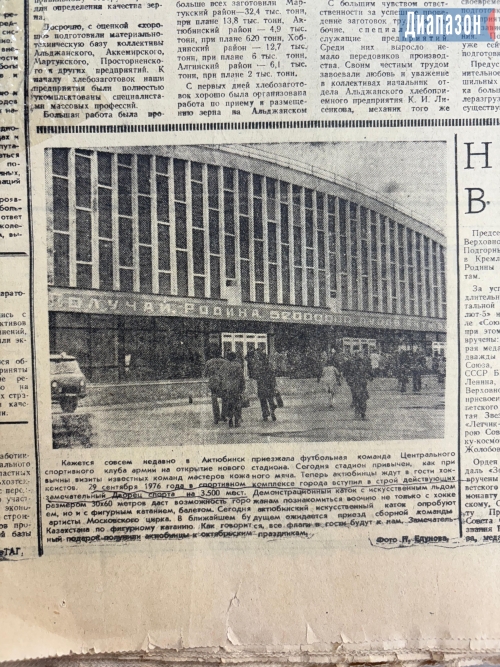 «29 сентября 1976 года вступил в строй замечательный Дворец спорта на 3500 мест. Демонстрационный каток с искусственным льдом размером 30х60 метров даст возможность горожанам познакомиться воочию не только с хоккеем, но и с фигурным катанием, балетом. Сегодня актюбинский каток опробуют артисты Московского цирка. В ближайшем будущем ожидается приезд сборной команды Казахстана по фигурному катанию», - говорится в статье «Путь к коммунизму» за 2 октября 1976 года.